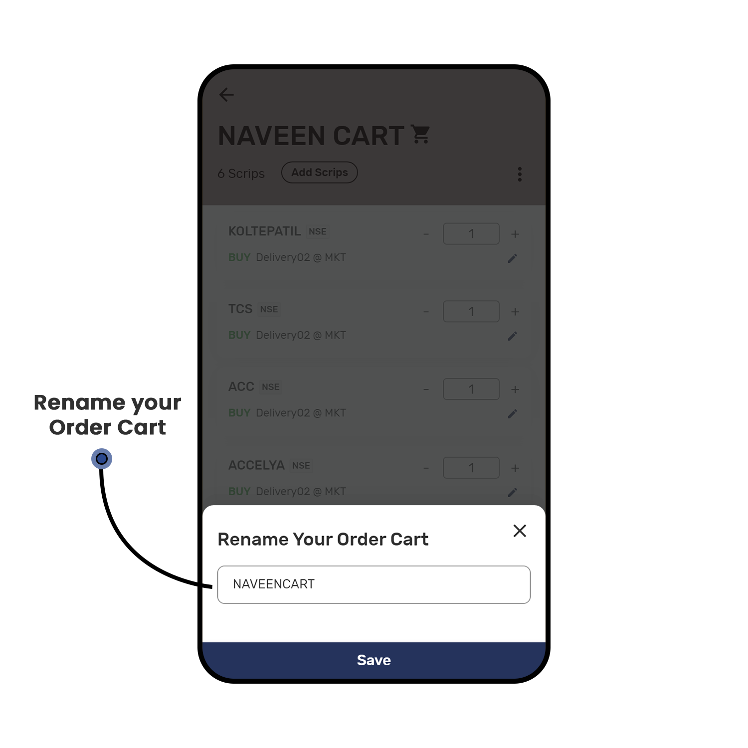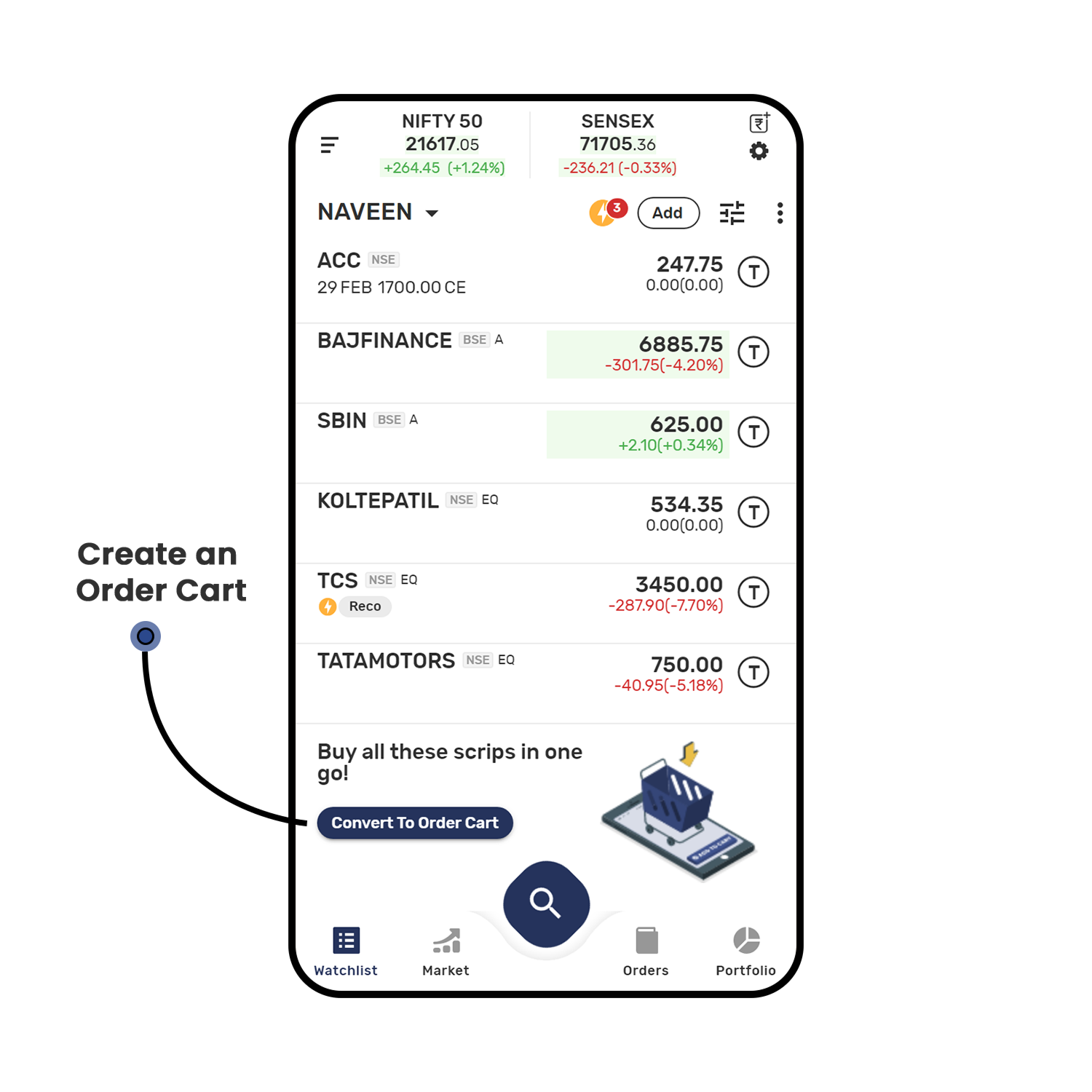 Create multi-scrip orders using Order Cart and execute them on the go. Users can add individual scrips to a Cart Icon OR convert a watchlist into a Cart Icon