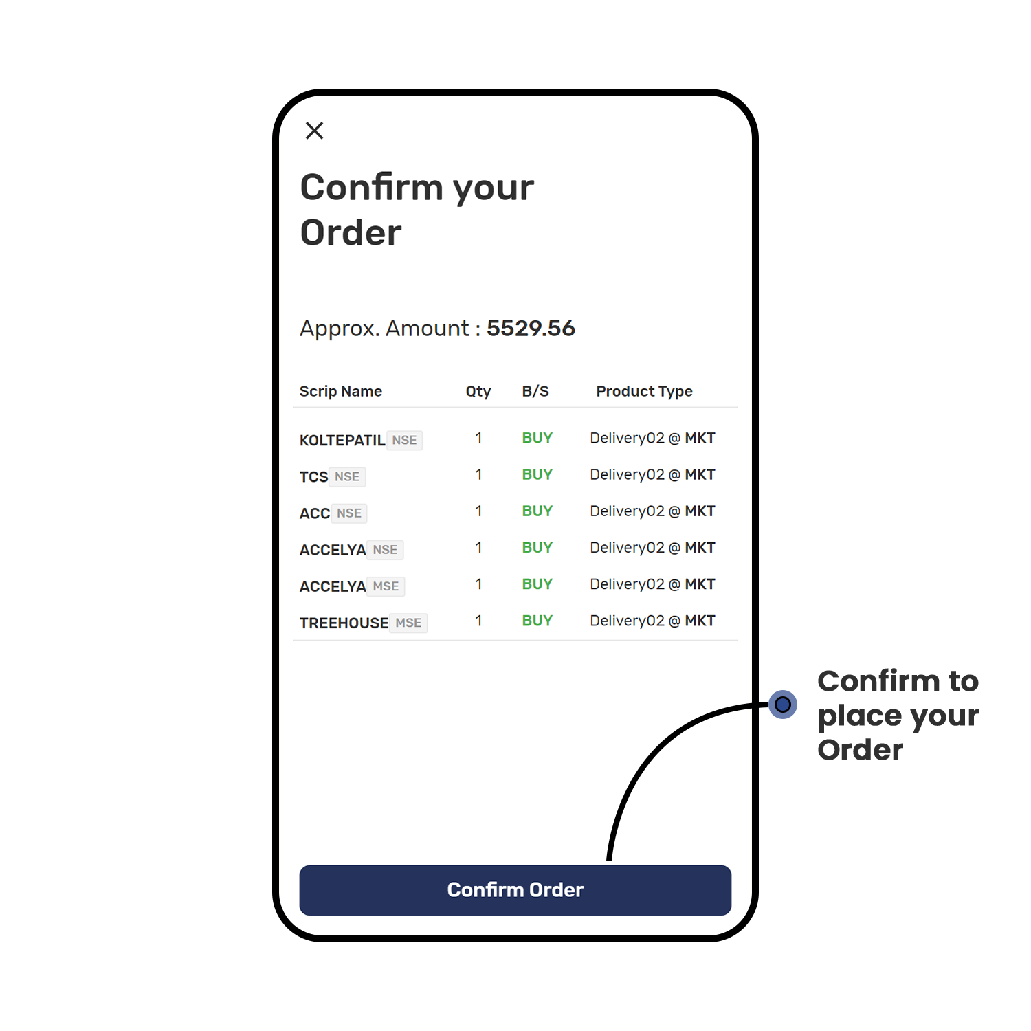 The application supports all the major order types such as, Intraday, Delivery, Margin Trading Facility (MTF), Purchase Today Sell Tomorrow (PTST), Multileg, Spread.