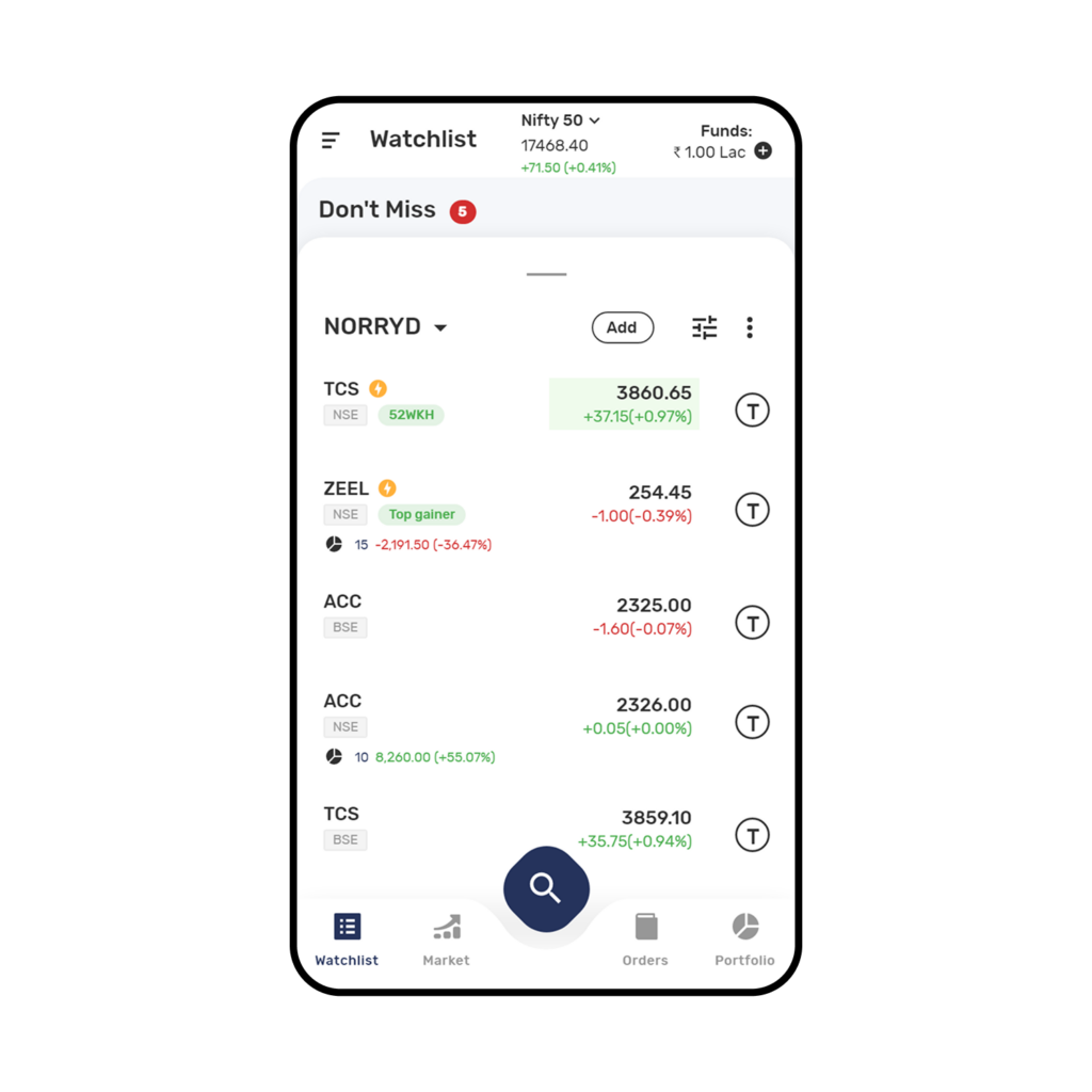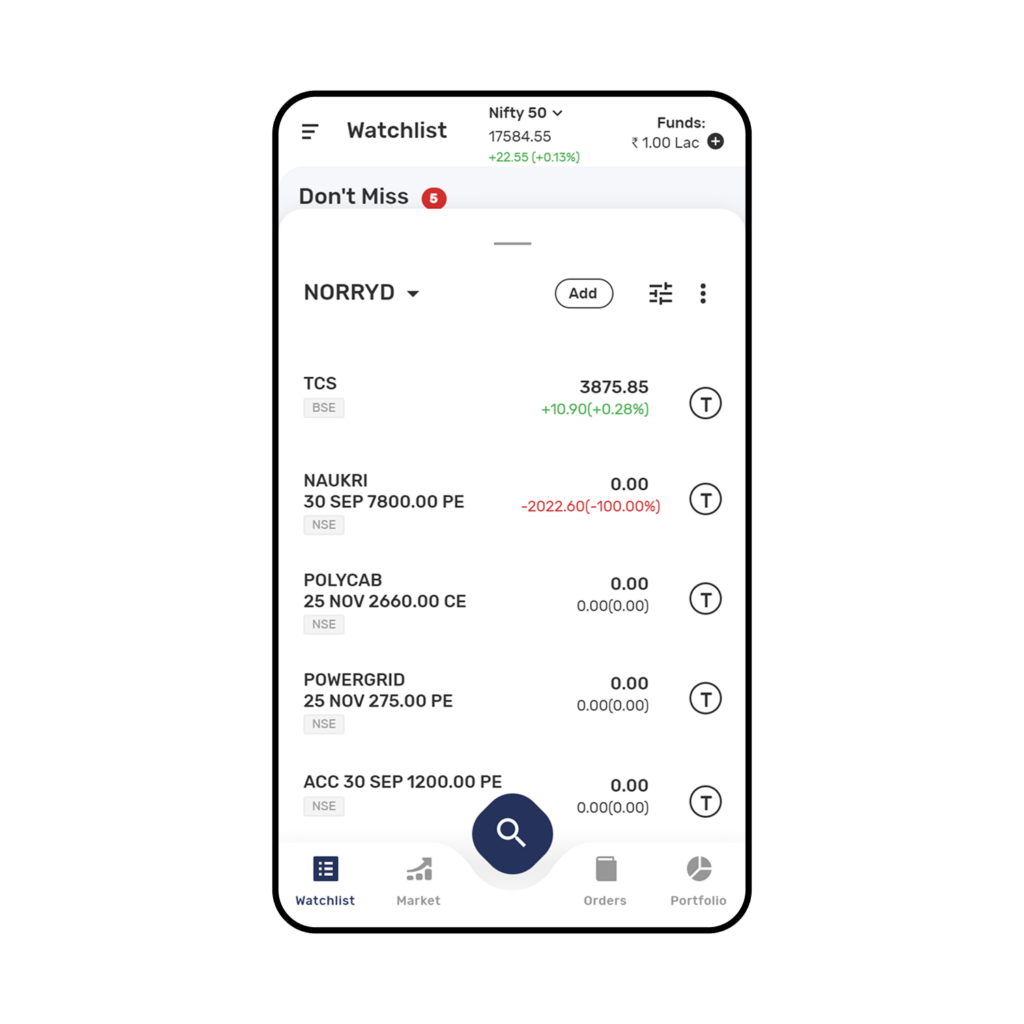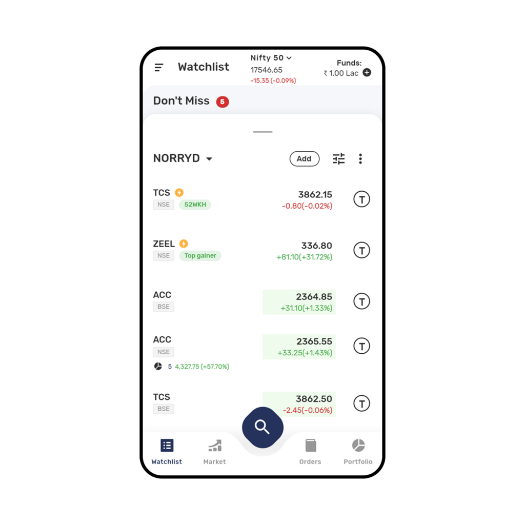 The Application also creates a dedicated Watchlist to showcase the scrips which you should not miss. You can set the Don’t Miss Watchlist as default by using the drop-down option the watchlist.