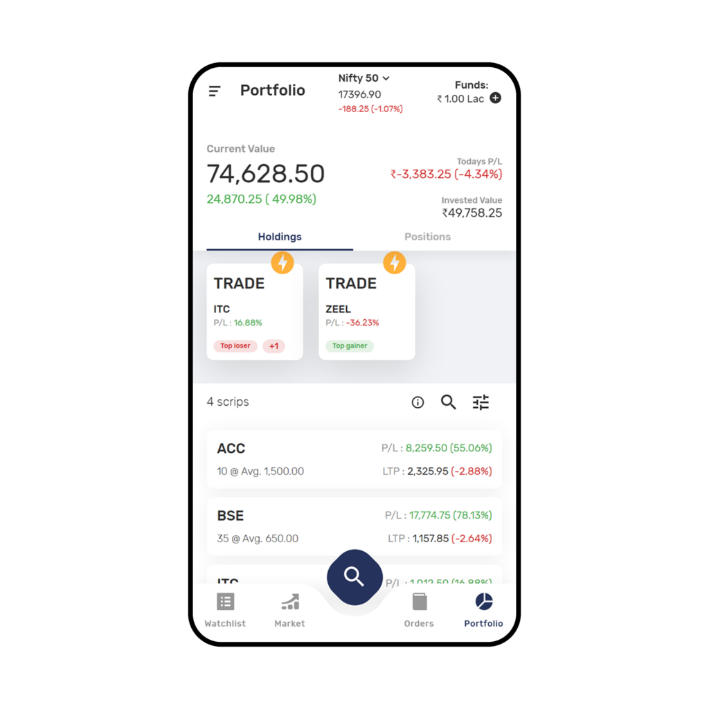 If you hold any of the scrips in your Watchlist, the application will highlight Portfolio Icon (portfolio) the no. of shares you hold along with the Unrealised Profit or Loss from the purchase price.